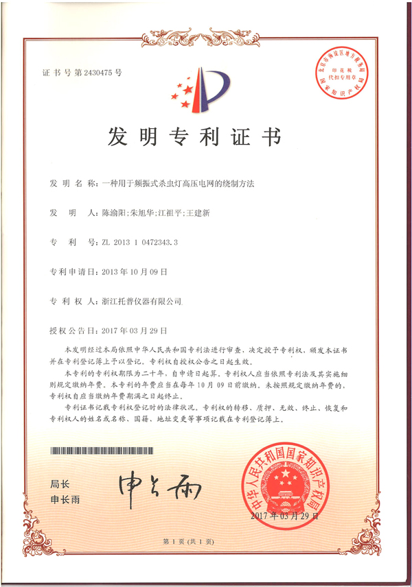 近日,我司托普云農(nóng)又喜獲一項(xiàng)發(fā)明專利。據(jù)悉,該發(fā)明專利名稱為“一種用于頻振式殺蟲燈高壓電網(wǎng)的繞制方法”,發(fā)明專號為ZL201310472343.3。