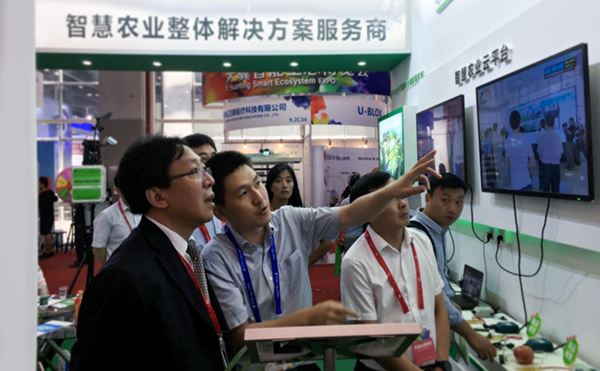展會期間,中國電信集團(tuán)公司政企客戶事業(yè)部總經(jīng)理梁寶俊一行蒞臨托普展區(qū),了解物聯(lián)網(wǎng)技術(shù)在智慧農(nóng)業(yè)領(lǐng)域的應(yīng)用情況。托普云農(nóng)營銷總監(jiān)陳曦從農(nóng)業(yè)生產(chǎn)智能化、農(nóng)業(yè)產(chǎn)業(yè)管理、農(nóng)業(yè)應(yīng)急指揮、農(nóng)產(chǎn)品溯源、農(nóng)村公共服務(wù)等涉農(nóng)領(lǐng)域詳細(xì)介紹托普云農(nóng)農(nóng)業(yè)物聯(lián)網(wǎng)的發(fā)展現(xiàn)狀。在聽完托普云農(nóng)農(nóng)業(yè)物聯(lián)網(wǎng)建設(shè)所取得的成果后,梁寶俊高度評價(jià)托普云農(nóng)在農(nóng)業(yè)物聯(lián)網(wǎng)領(lǐng)域的專業(yè)性。