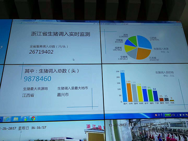 本屆農(nóng)博會信息化元素顯著,重點展出農(nóng)業(yè)數(shù)據(jù)庫建設(shè)、農(nóng)業(yè)智慧管理、追溯體系建設(shè)、農(nóng)產(chǎn)品電子商務(wù)發(fā)展。在農(nóng)博會上,由托普云農(nóng)子公司浙江森特信息技術(shù)有限公司為浙江省畜牧獸醫(yī)局研發(fā)的浙江省智慧畜牧云平臺也亮相現(xiàn)場。 動態(tài)在線監(jiān)管,實時顯示豬舍、消毒通道、屠宰車間等畫面。