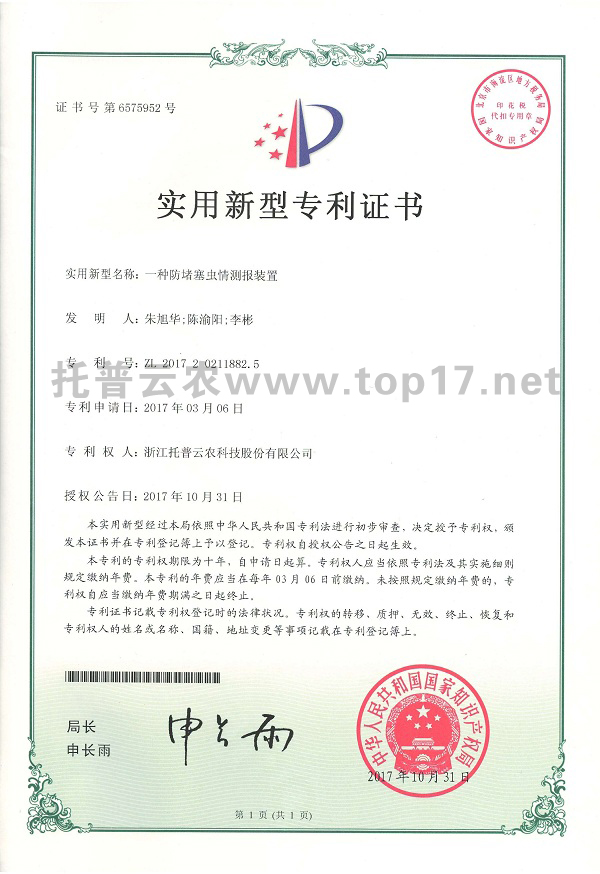 繼智能識(shí)別蟲情測(cè)報(bào)燈控制軟件獲得國(guó)家版權(quán)局軟件著作權(quán)后,托普云農(nóng)在蟲情測(cè)報(bào)領(lǐng)域再取得新突破。10月31日,由托普云農(nóng)研發(fā)的“一種防堵塞蟲情測(cè)報(bào)裝置”,獲得國(guó)家知識(shí)產(chǎn)權(quán)局實(shí)用新型專利授權(quán),授權(quán)專利號(hào):ZL 2017 2 0211882.5。