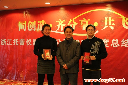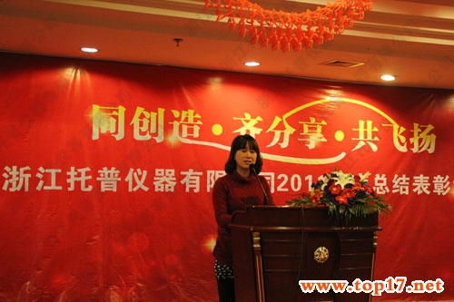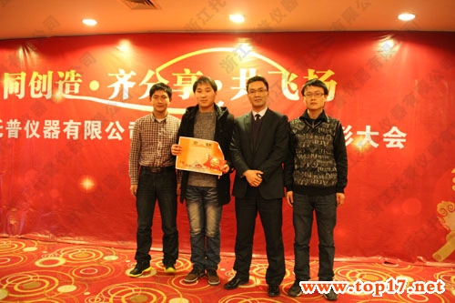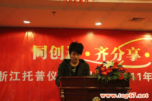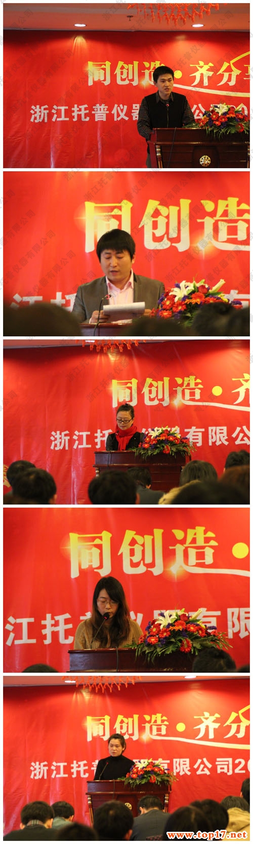 本次大會的議程共有五項。一、由陳渝陽總經理做2011年的工作總結報告,并提出2012年的工作重點是不斷完善現有產品的品質控制及加強各個部門的團隊建設;二、是由公司各副總對2011年度工作進行匯報總結,并指出對2012的展望及規(guī)劃;三、由銷售內貿部、外貿部、市場部、生產部、研發(fā)部、技術部、網絡部、財務部、人事部、行政部等各部門經理分別上臺匯報11年各部門工作取得的成績及存在的不足,并對2012年工作進行了合理規(guī)劃;四、由公司總經理、各分管副總為浙江托普儀器年度優(yōu)秀新人、優(yōu)秀員工、優(yōu)秀主管、總經理特別獎等獲獎人員進行表彰;四、向先進單位和優(yōu)秀個人頒獎,為托普精英們頒發(fā)證書和獎金并合影留念;五、公司迎新春晚會。