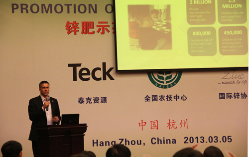在上午的鋅肥示范推廣技術(shù)培訓(xùn)與研討會(huì)上,會(huì)議邀請(qǐng)了國(guó)際專(zhuān)家加拿大泰克資源安德魯·格林教授、國(guó)際鋅協(xié)會(huì)樊明憲教授、國(guó)內(nèi)專(zhuān)家浙江大學(xué)副教授馮英、天津市土壤肥料工作站鄭育鎖科長(zhǎng)講解了鋅肥技術(shù)以及鋅肥在中國(guó)農(nóng)業(yè)生產(chǎn)中試驗(yàn)示范研究結(jié)果。據(jù)國(guó)際鋅協(xié)會(huì)報(bào)道,全球種植谷物的土地中有50%存在缺鋅的潛在危險(xiǎn)、而我國(guó)土壤普遍缺鋅。農(nóng)作物缺鋅主要與干旱缺水、鹽堿、漬澇等農(nóng)田環(huán)境有關(guān),科學(xué)施用鋅肥是解決農(nóng)業(yè)缺鋅問(wèn)題的主要途徑。近年來(lái),隨著節(jié)水農(nóng)業(yè)的不斷發(fā)展,水肥一體化逐漸成為新的鋅肥科學(xué)施用方式?茖W(xué)施用鋅肥,能夠提高作物產(chǎn)量,改善農(nóng)產(chǎn)品品質(zhì)。為促進(jìn)鋅肥的科學(xué)施用,廣泛宣傳鋅對(duì)作物生產(chǎn)和人體健康的作用,全國(guó)農(nóng)技推廣中心與國(guó)際鋅協(xié)會(huì)、加拿大泰克資源合作開(kāi)展鋅肥示范推廣工作,并大力培養(yǎng)應(yīng)用技術(shù)人才、開(kāi)展田間技術(shù)指導(dǎo)。
