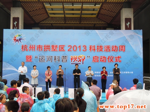 2013年5月17日上午,拱墅區(qū)2013年科技活動(dòng)周暨“運(yùn)河科普視界”活動(dòng)啟動(dòng)儀式在小河路中國杭州刀剪劍博物館廣場隆重舉行。此次科技活動(dòng)周主題為“科技推動(dòng)創(chuàng)新 建設(shè)幸福拱墅”。杭州市科協(xié)主席鄔麗娜、杭州市科委副巡視員徐植、浙江省科協(xié)科普部副部長姜曉東、拱墅區(qū)四套班子領(lǐng)導(dǎo)、市科委、市科協(xié)、浙大城市學(xué)院、浙江樹人大學(xué)等領(lǐng)導(dǎo)應(yīng)邀出席開幕式。區(qū)各相關(guān)機(jī)關(guān)單位、職能部門、街道科協(xié)、區(qū)屬學(xué)(協(xié))會(huì)、轄區(qū)高校、高新技術(shù)企業(yè)代表、社區(qū)居民等500多人參加開幕式,共同啟動(dòng)了2013年拱墅區(qū)科技活動(dòng)周暨“運(yùn)河科普視界”活動(dòng)。