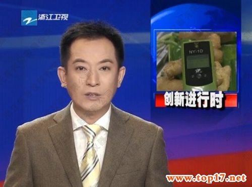 圖為:浙江新聞聯(lián)播報(bào)道正在檢測(cè)蔬菜農(nóng)殘的攤主