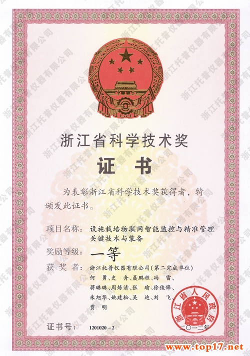 為了鼓勵(lì)科學(xué)技術(shù)創(chuàng)新,促進(jìn)科學(xué)技術(shù)進(jìn)步和社會(huì)經(jīng)濟(jì)發(fā)展,根據(jù)《浙江省科學(xué)技術(shù)獎(jiǎng)勵(lì)辦法》,托普儀器的科研項(xiàng)目——《設(shè)施栽培物聯(lián)網(wǎng)智能監(jiān)控與精準(zhǔn)管理關(guān)鍵技術(shù)與裝備》,經(jīng)過(guò)省科學(xué)技術(shù)評(píng)審委員會(huì)審定,被評(píng)為2012年度浙江省科學(xué)技術(shù)獎(jiǎng)一等獎(jiǎng)。
