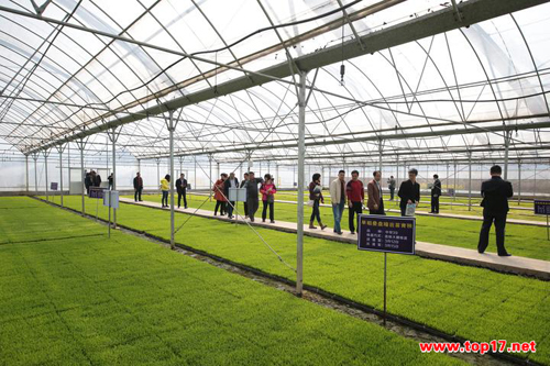 圖為:交流會(huì)人員在參觀智能化育秧大棚