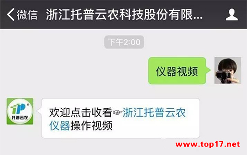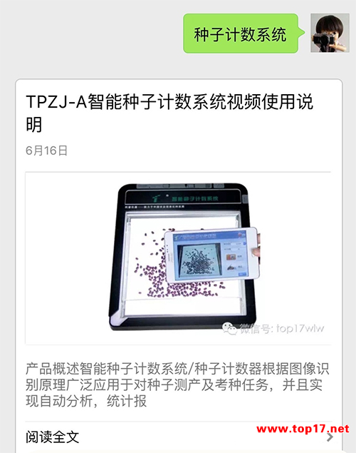 現(xiàn)在只需關(guān)注“浙江托普云農(nóng)科技股份有限公司”的微信公眾號(hào),回復(fù)對(duì)應(yīng)的關(guān)鍵字,即可查看儀器操作視頻,比如需要查看智能種子技術(shù)系統(tǒng)的操作視頻,只需要回復(fù)“種子計(jì)數(shù)系統(tǒng)”或者儀器型號(hào)即可了解如何使用儀器,查看儀器的相關(guān)參數(shù)和功能。