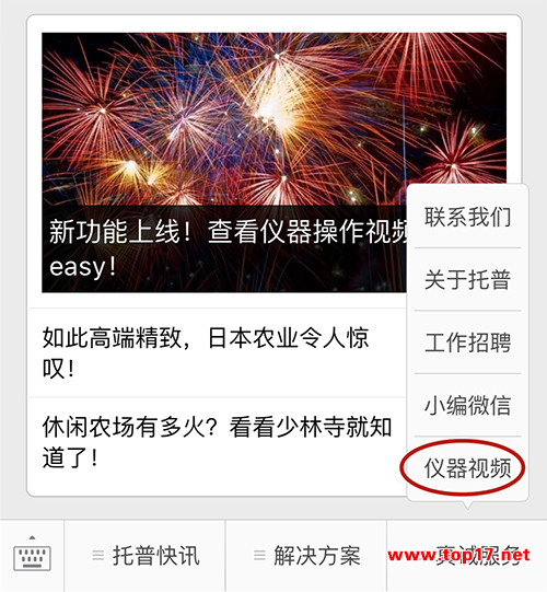 在“浙江托普云農(nóng)科技股份有限公司”微信號(hào)的菜單欄也提供了查看視頻的入口,只需要選擇“真誠服務(wù)”→“儀器視頻”即可進(jìn)入頁面查看。