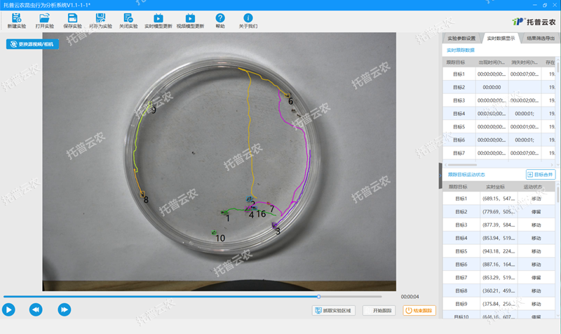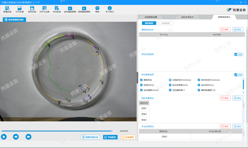 托普TP-KCXW昆蟲行為分析系統(tǒng)使用專用軟件對錄制的昆蟲活動視頻或傳入實時昆蟲觀測視頻流進行分析,識別并跟蹤目標昆蟲,獲取昆蟲隨時間變化的(X,Y)坐標,同時記錄輸出十余種昆蟲運動相關(guān)參數(shù),記錄運動軌跡圖,實現(xiàn)昆蟲運動可視化分析,輔助昆蟲行為研究。